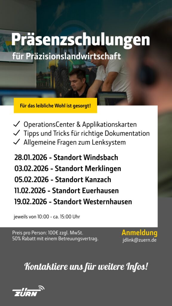 Du willst dich in der ruhigen Jahreszeit in Sachen OperationsCenter, Lenksystem-Fahrerschulungen sowie Xarvio und Applikationskarten weiterbilden, damit es im Frühjahr schneller und präziser von der Hand geht? Wir schulen in MS Teams kostenfrei und live mit der Möglichkeit Fragen zu stellen!
